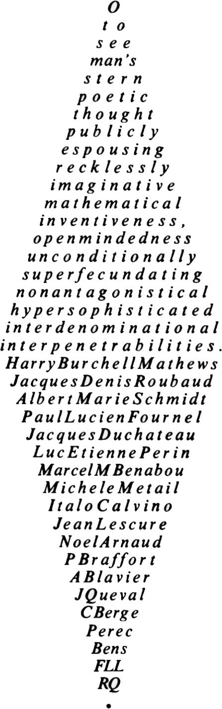 In November of 1960, the novelist Raymond Queneau and the mathematician François Le Lionnais founded a small Parisian group they called the Ouvroir de Littérature Potentielle: the Workshop of Potential Literature, or OULIPO.1 The founding meeting was convened as a subcommittee of the Collège de ’Pataphysique, the Parisian institution devoted to the science of “imaginary solutions” and the study of exceptions, and the group was largely made up of novelists, mathematicians, engineers, and poets. “Potential Literature” described their ideal of what writing could become if put under the right kind of pressure. Their intent according to Queneau was: “To propose new ‘structures’ to writers, mathematical in nature, or to invent new artificial or mechanical procedures that will contribute to literary activity: props for inspiration as it were, or rather, in a way, aids for creativity.” Essentially, their idea was to apply sets of rules and mathematical formulae to the process of writing as a means of building conditions under which literature might become something it had never been before.