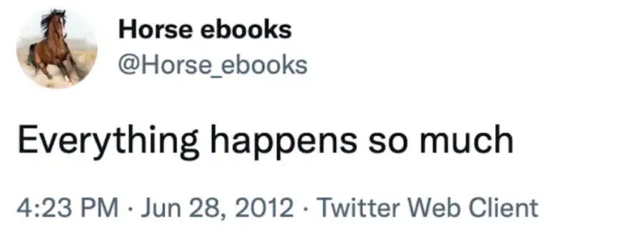 At the risk of embarrassing myself, I want to draw attention to a particular internet phenomenon that was undoubtedly Oulipan in nature: Weird Twitter. Weird Twitter was a very loose movement of writers, comedians, and poets on Twitter (I will never call it X) around approximately 2012 who, due to the strict 140-character limit, began playing with language in new and innovative ways. For better or for worse, this largely changed the ways that people think and speak online forever. Alt-lit was largely born from this. Unknown comedians with no connections began getting television writing jobs purely as a result of their Twitter accounts.15 Poets and writers got book deals.16 @dril, one of its central figures and arguably the greatest shitposter of all time, was ranked by Slate alongside Umberto Eco and Anne Carson as one of the best writers of 2017, and published a book of his tweets.17 Welcome to Night Vale gained a huge Twitter following, pioneered the podcast audio drama format, and became the number one most downloaded podcast on iTunes in July 2013.18