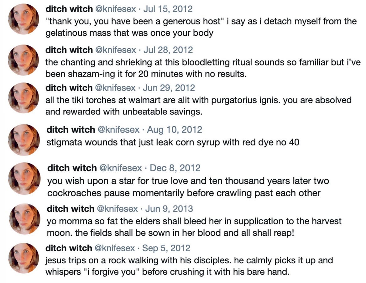 I was a semi-prominent member of this group, posting under @knifesex, though I take no credit for its effects, nor do I mention this in any self-aggrandizing way (lol). I was simply a person who saw and recognized what was happening to language and culture online in real time, and participated in something that at the time felt very alive and fun. I had not done much creative writing previously but the medium and its constraints allowed me to channel my anguish at the state of the world and my own mind into short snippets of absurdist horror poetry, allowing me to move through a period of profound depression with levity. I became friends with the Welcome to Night Vale creators after bonding over our dark senses of humor and contributed writing to their episode “Poetry Week.”19 I connected with many other creative people during that time I’m still friends with today.